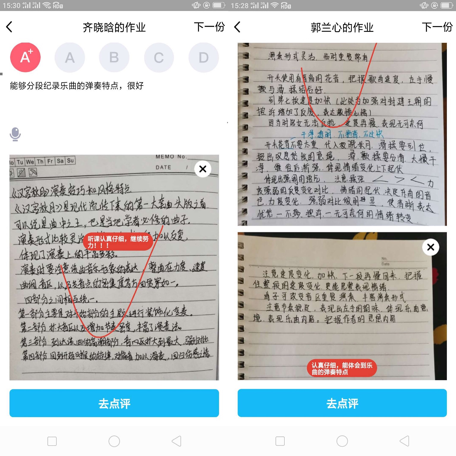 在进行直播授课时,偶尔不稳定的网络信号会影响授课质量,师生们对于乐器音色的变化与对比也无法达到准确的辨析。针对这种情况,马立婧老师要求学生提前录制弹奏视频发送到学习群,既可以更精准的听乐曲,又方便老师记录学生的问题,在直播授课或语音沟通时把问题反馈给学生并进行详细指导,确保在线教学效果能够最大程度地接近线下的面授效果。