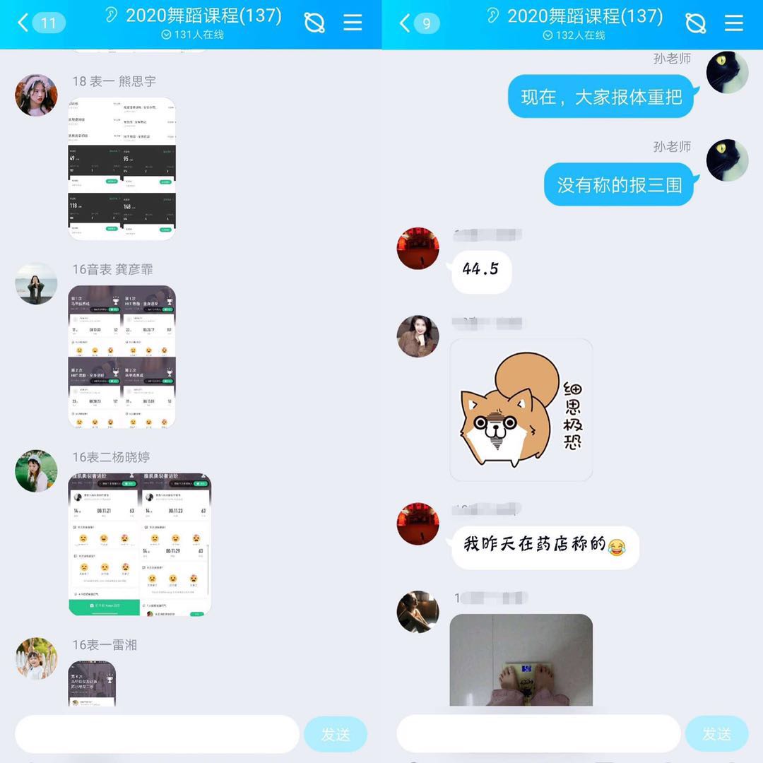 在停课不停学的疫情特殊时期,如何保证学生身体软开度、基本体力、肌肉力量等舞蹈课程要求的身体素质,孙晓丹老师精心设计、煞费苦心。在利用手机运动软件规定学生日常自行训练强度并要求每周周五上传完成截图的同时,督促学生控制体重,利用直播上课软件分年级直播教学,带领学生进行软开度训练以及肌肉力量恢复训练。