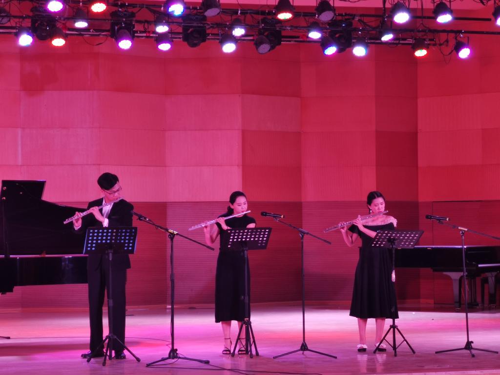 音乐会开始,一曲《降E大调奏鸣曲》全曲3个乐章是中庸的快板、西西里舞曲、快板。总奏主题由钢琴呈示,主奏主题由长笛呈示,如协奏曲般交替西西里舞曲,长笛的演奏儒雅,有风度,记忆娴熟,技艺高超,让人如痴如醉,感人肺腑。接着是一曲贺绿汀的《幽思》,这首乐曲结构完整、旋律优美、情趣高雅,表现出情景交融的极高艺术境界。其内涵丰富的音乐表现力与流畅自如的演奏形式充分地展现了长笛演奏者高超的演奏技艺,美轮美奂。最后,一曲《探个够》作为本场音乐会的结尾。长笛与小提琴,单簧管,萨克斯等乐器的配合堪称完美,乐声丝丝入耳,悠扬中透露着无限柔美,顿时洋溢着现场的每个角落。至此,音乐会到此圆满结束。指导教师庞景梁对此次音乐会作了最后致辞,对武宝川同学四年来获得的成绩给予了肯定,对未来之路寄予了厚望。