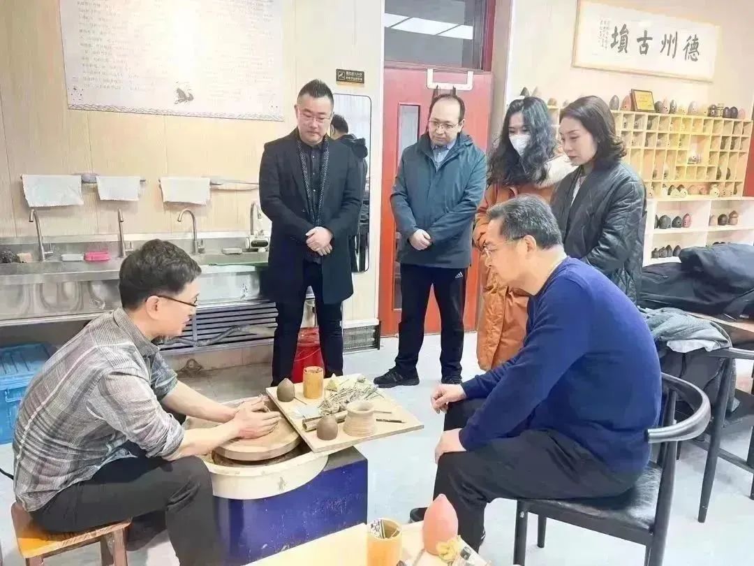在德州古埙工作室,孟宇参观了各类古埙成品,德州古埙制作技艺第四代传承人徐琦博士汇报了我院在非遗保护与传承方面所做工作,以及近年来我院与德城区各企业、学校等部门深入合作所取得的工作成效。随后,徐琦展示了技艺的拉坯、打孔、调音等环节,并示范演奏了埙特有的古朴音色。