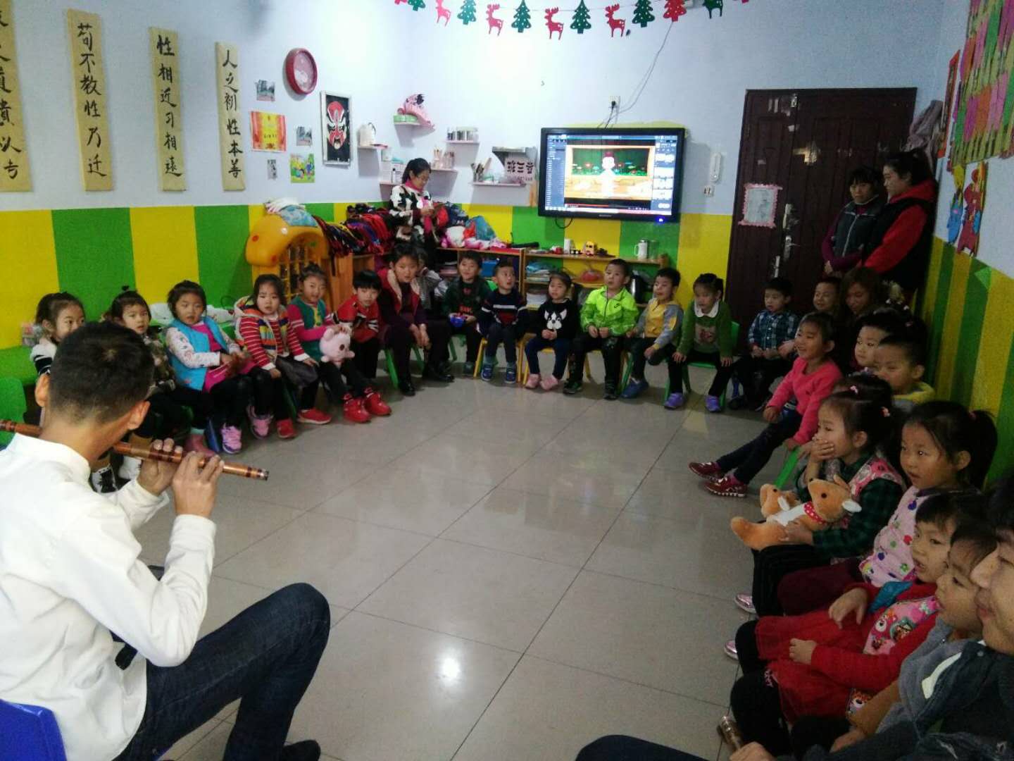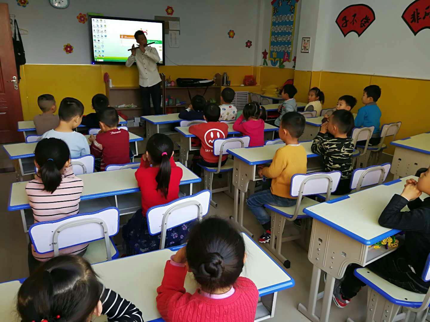 志愿者们为孩子们准备了儿歌、舞蹈以及器乐合奏等节目。首先,志愿者们两人一组依次为孩子们表演节目,其中歌曲《世上只有妈妈好》最受孩子们欢迎。之后,志愿者与孩子们一起做游戏。表演过程中孩子们全神贯注并积极与志愿者互动。通过与孩子们互动,志愿者们看到了孩子的可爱、活泼与阳光。