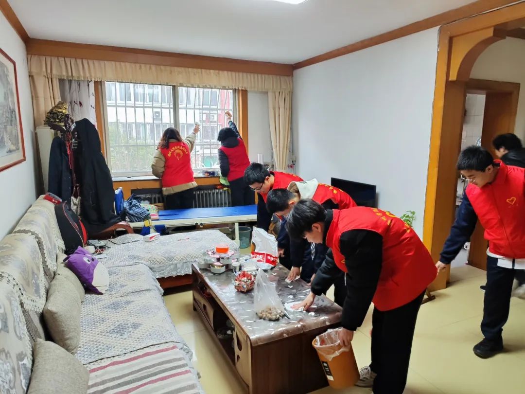 志愿者们走进老人家中,向老人送去亲切的关怀和问候,关心问询老人的饮食起居和身体状况,倾听他们的心声。主动向老人分享大学生活中的点滴趣事,屋内瞬间热闹起来,充满了欢声笑语。志愿者们有的拿起工具打扫卫生,有的陪在老人床前唠嗑。彼此其乐融融、宛如一家,做到了“手拉着手话家常,心连着心递温暖”。
