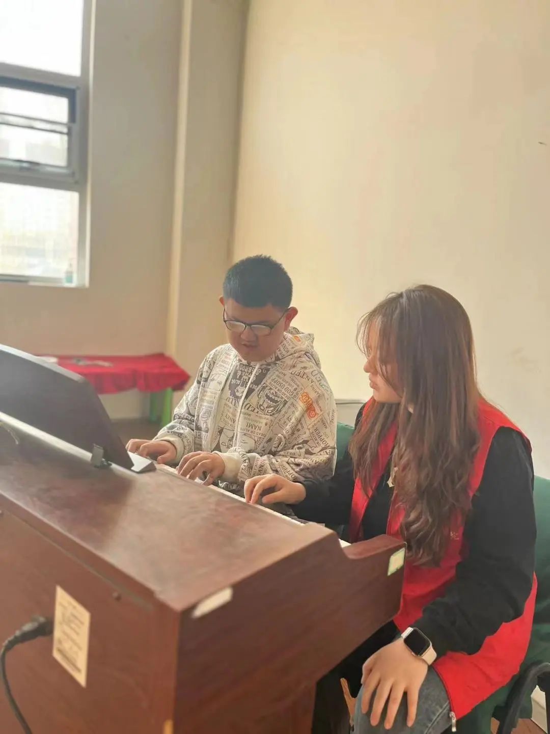 在特殊学校教室里,志愿者结合自身专业优势对特殊儿童开展声乐、乐器、舞蹈等教学。孩子们小心翼翼地摸着琴键,用手触碰一张张乐谱,用心倾听音符的跳动,感受音乐带来的魅力。