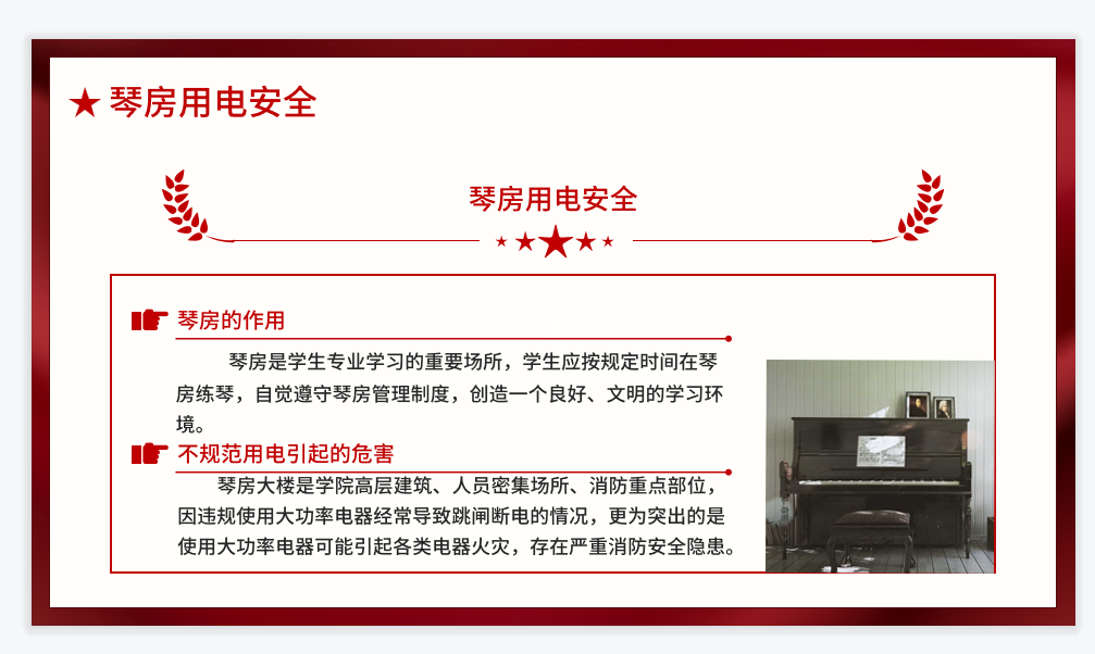 主持人分别讲解了宿舍、琴房、教室三个场所用电的注意事项。同时结合近期各大高校发生火灾事故的新闻报道,详细介绍了违禁电器的种类及危害。用真实案例提醒大家用电安全不容小觑,倡导同学们拒绝使用违禁电器,共同构建安全校园。