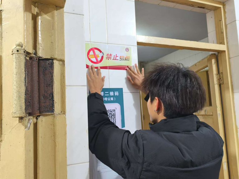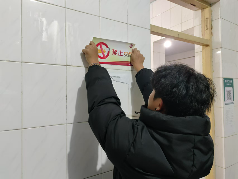 在宿舍大门、楼道、公共区域等显著位置进行张贴。在张贴过程中,还向同学们详细讲解了吸烟对自身及他人健康的不良影响,尤其是在宿舍这种相对封闭空间内,二手烟极易危害室友健康,易引发安全事故,如火灾等。