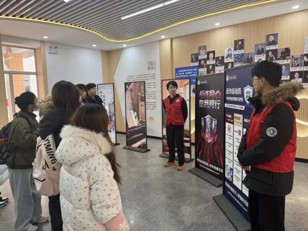 学院着力构建反诈宣传的长效机制,精心设计反诈知识宣传展板,常态化布设于音乐楼大厅、琴房门口、学生公寓入口等人员流动频繁的醒目位置。展板内容系统梳理了当前高发诈骗类型的关键特征和防范建议,并配以简洁明了的警示语和直观的图示。这些固定展板成为时刻提醒学生保持警惕的“无声课堂”,潜移默化地强化了学生的风险防范意识,有效弥补了集中宣讲的时效局限,营造了无处不在、无时不有的反诈警示环境,切实提升了学生的日常防范能力。