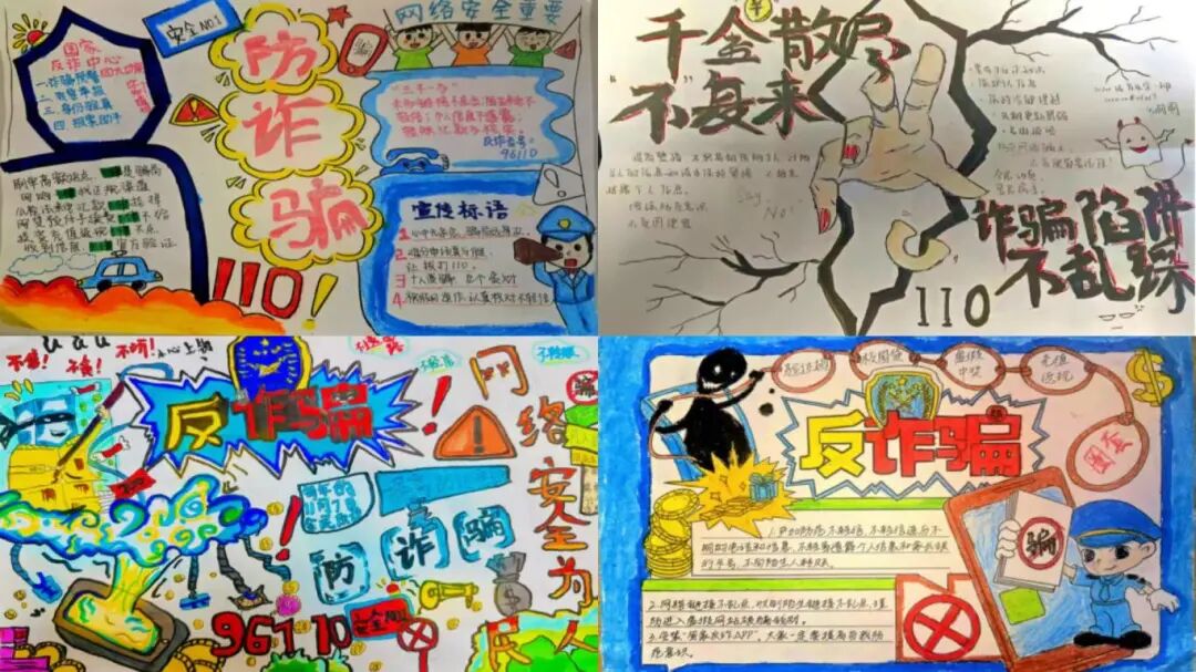 为促进反诈教育入脑入心,学院策划“青春无‘诈’,‘艺’同守护”反诈主题手抄报创作活动。鼓励学生将反诈知识、案例警示、防范口诀等核心内容,通过艺术构图、色彩搭配和版面设计进行视觉化呈现。同学们积极参与,创作出的作品不仅主题突出、创意十足,更在绘制过程中加深了对诈骗套路识别与防范要点的理解。优秀作品在学院公共区域集中展示,形成了“边走边学”的移动课堂,实现了反诈宣传从被动接收到主动创作、从知识记忆到理念内化的升华,教育效果更为持久和深刻。