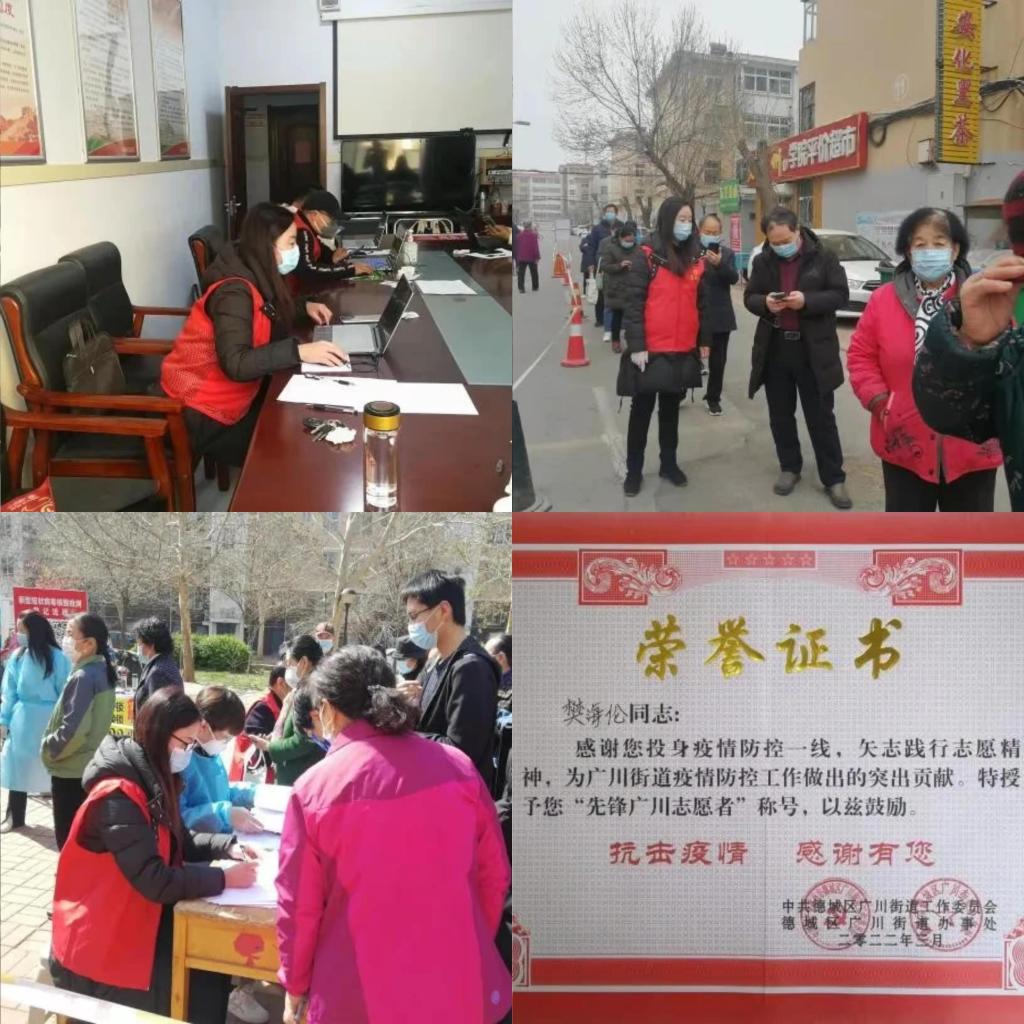 2022年3月以来,随着严峻的疫情防控,在社区、在小区、在学校,经常可以看到樊海伦同志作为志愿者服务的身影。她时刻牢记作为一个共产党员的初心和使命,时刻以党员的高标准严格要求自己,认真履行党员的责任和义务,能够起到模范带头的引领作用,履行好全心全意为人民服务的宗旨。3月18日主动去学府社区进行志愿服务,给从中高风险地区返德的人员打电话,核实他们往返时间及做核酸的次数等。3月21日在学府家园进行志愿服务,帮助检测核酸的居民扫码、注册、登记等。4月3日、4日、5日去学府社区进行志愿服务,把居民信息录入平台系统。4月7日在学府家园进行志愿服务,给检测核酸的居民进行登记等。另外,在学校也是多次参与了志愿者服务工作。在疫情防控中,由于其突出的志愿者服务表现,被授予了“先锋广川志愿者”的荣誉称号。