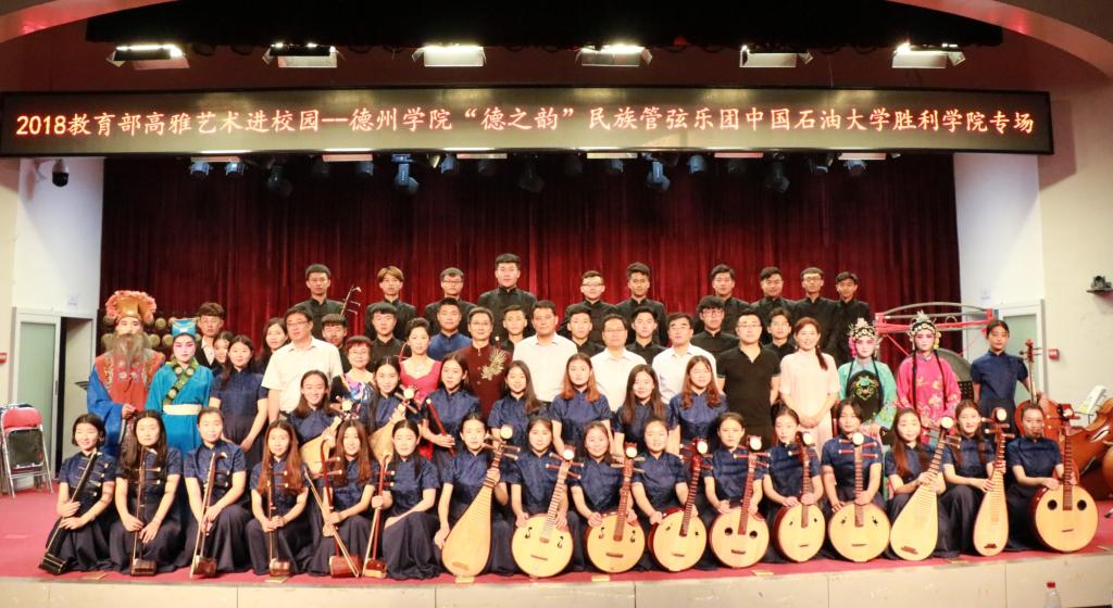 2018年6月1日,为响应教育部“高雅艺术进校园”的活动号召,英国正版365首页副院长段文带领“德之韵”民族管弦乐团走进中国石油大学胜利学院开展了为期两天的学术交流与演出。出席领导有中国石油大胜利学院党委书记孙学斋、副院长刘兆军、党委副书记孟昭亮、学校老领导马存栋、英国正版365首页副院长段文、教育与艺术学院执行院长田孝彦、教育与艺术学院书记张超。