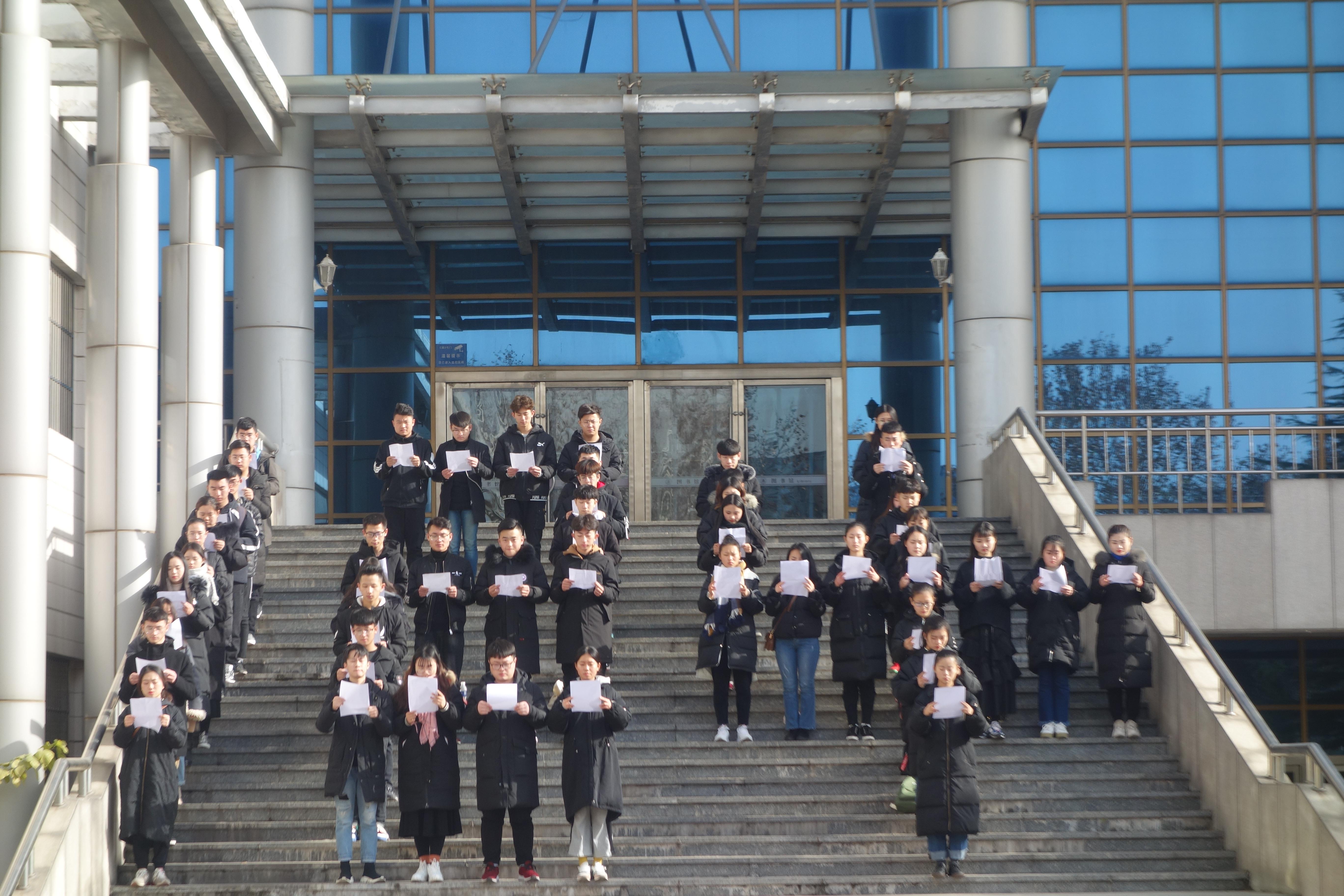 中午十二时,近百名身着黑色服装的学生,站姿挺拔,动作整齐划一,神情认真而严肃。大家沿着图书馆门前的台阶摆出12.4的造型,进行“百人诵读宪法”活动,诵读宪法总纲和部分章节内容,共同迎接第五个国家宪法日的到来,整个校园里回荡着学生们庄严的朗读声。活动最后,李曼宁对此次活动做了总结,希望同学们通过参加这次宪法诵读活动,能够更加自觉坚定“四个自信”,增强“四个意识”,坚定理想信念,自觉尊崇宪法、学习宪法、遵守宪法、维护宪法,大力弘扬宪法精神,牢固树立宪法法律至上、法律面前人人平等的法治理念,在推进全面依法治国的伟大进程中贡献青春力量。