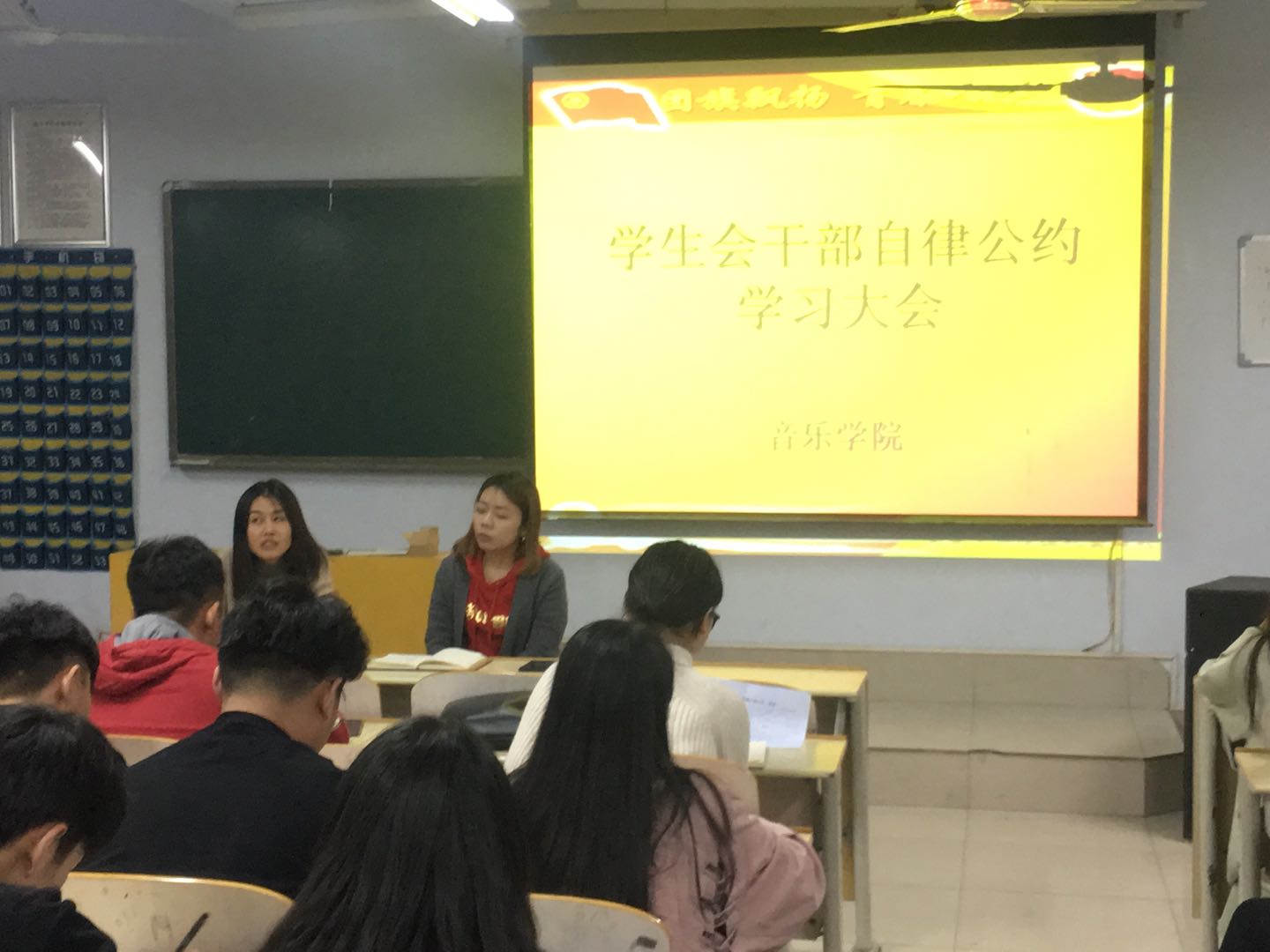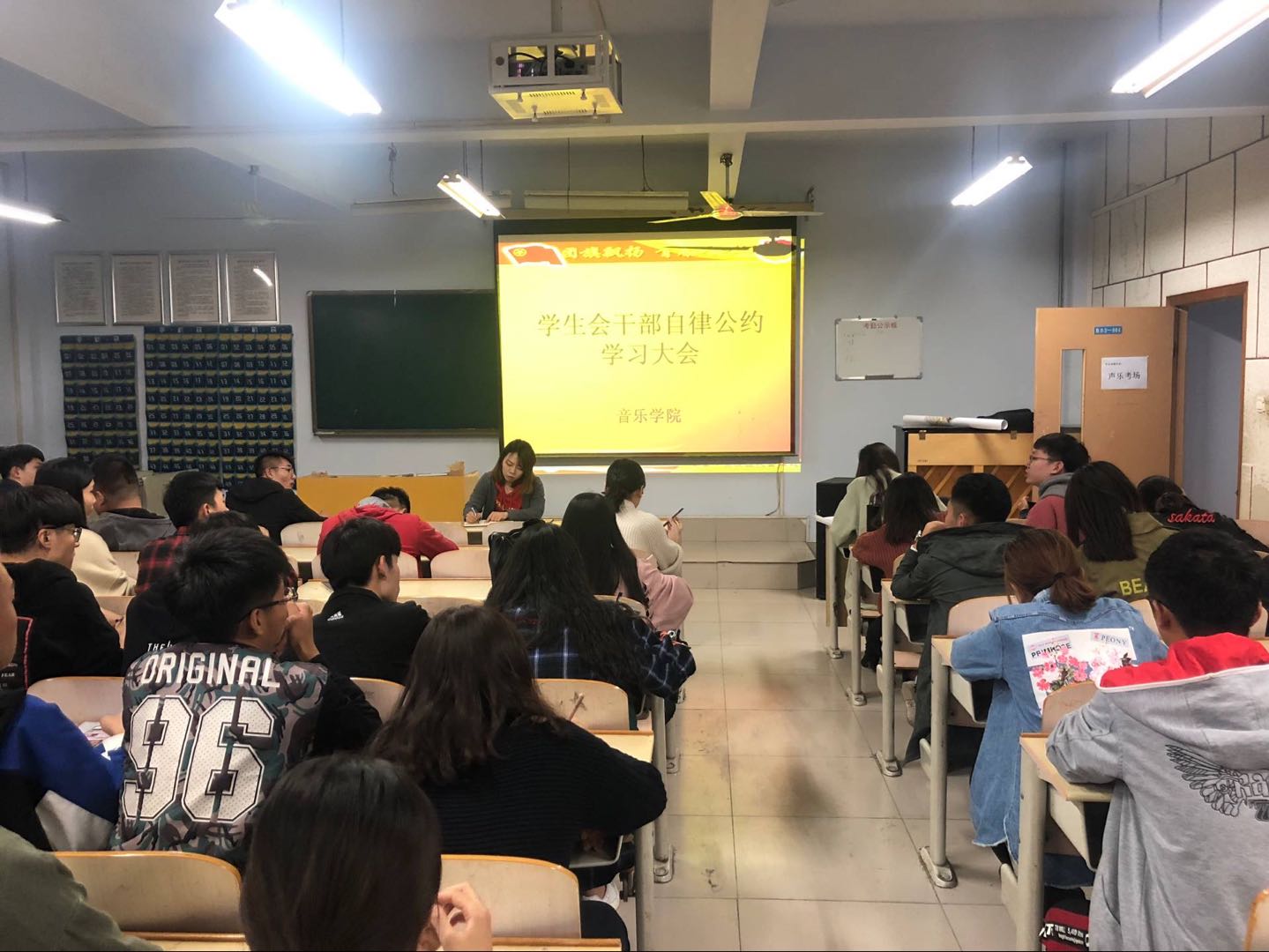 10月14日晚7点,英国正版365首页学生会在系三楼合堂召开了自律公约学习大会,团总支书记史璇、政治辅导员李曼宁以及25届全体学生会成员参会。