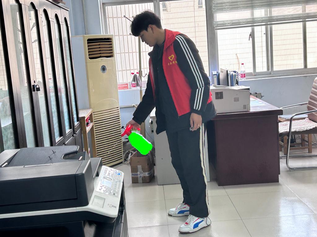 活动中,志愿者们分别对教室、琴房、宿舍、卫生间等进行消毒消杀。并辗转校园各个点位,重点对门把手、楼梯扶手、楼道地面、垃圾储物点等进行全面细致地消杀。坚决做到消杀工作不遗漏,无盲区,为校园流感防控提供了有力保障。