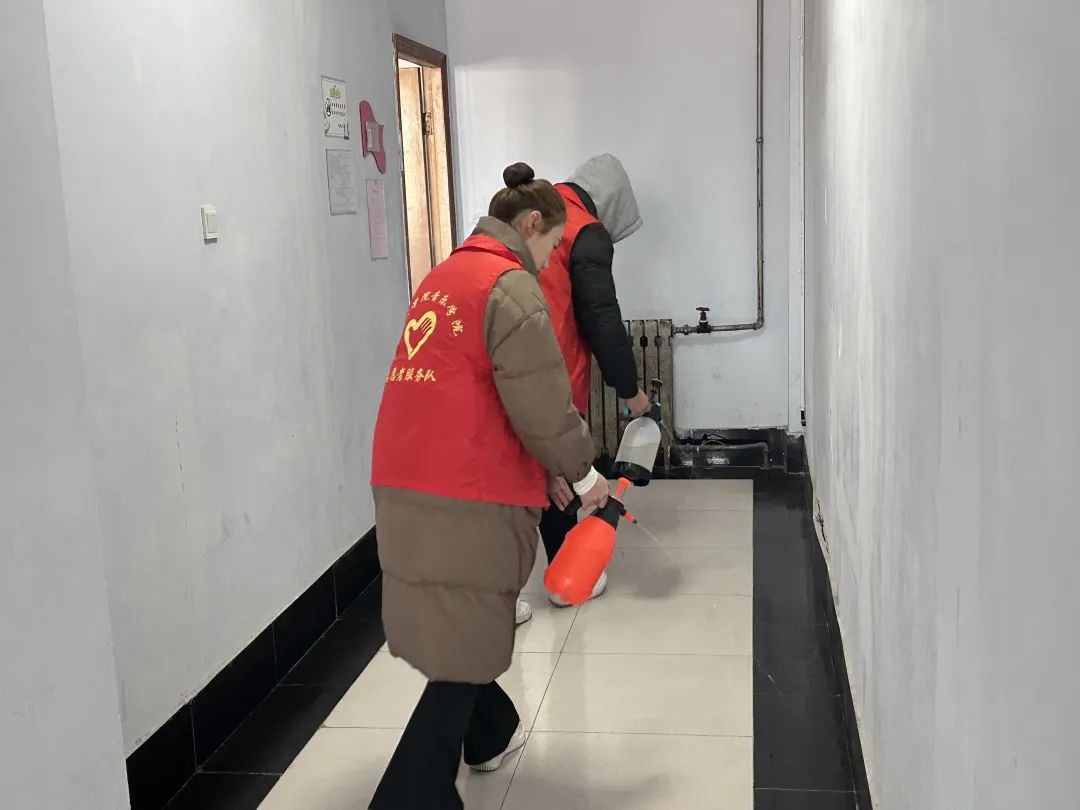 为确保消杀达到良好的效果,学生志愿者小组分工明确,配合默契,手持消毒器,严格按照卫生消毒管理的标准规范,按比例配兑消毒液进行喷洒,对学院教室、学生琴房、办公室及公共区域进行清洁消毒,做到不留死角、不留盲区,全方位覆盖,为我院师生免受冬季传染病侵袭提供了保障。
