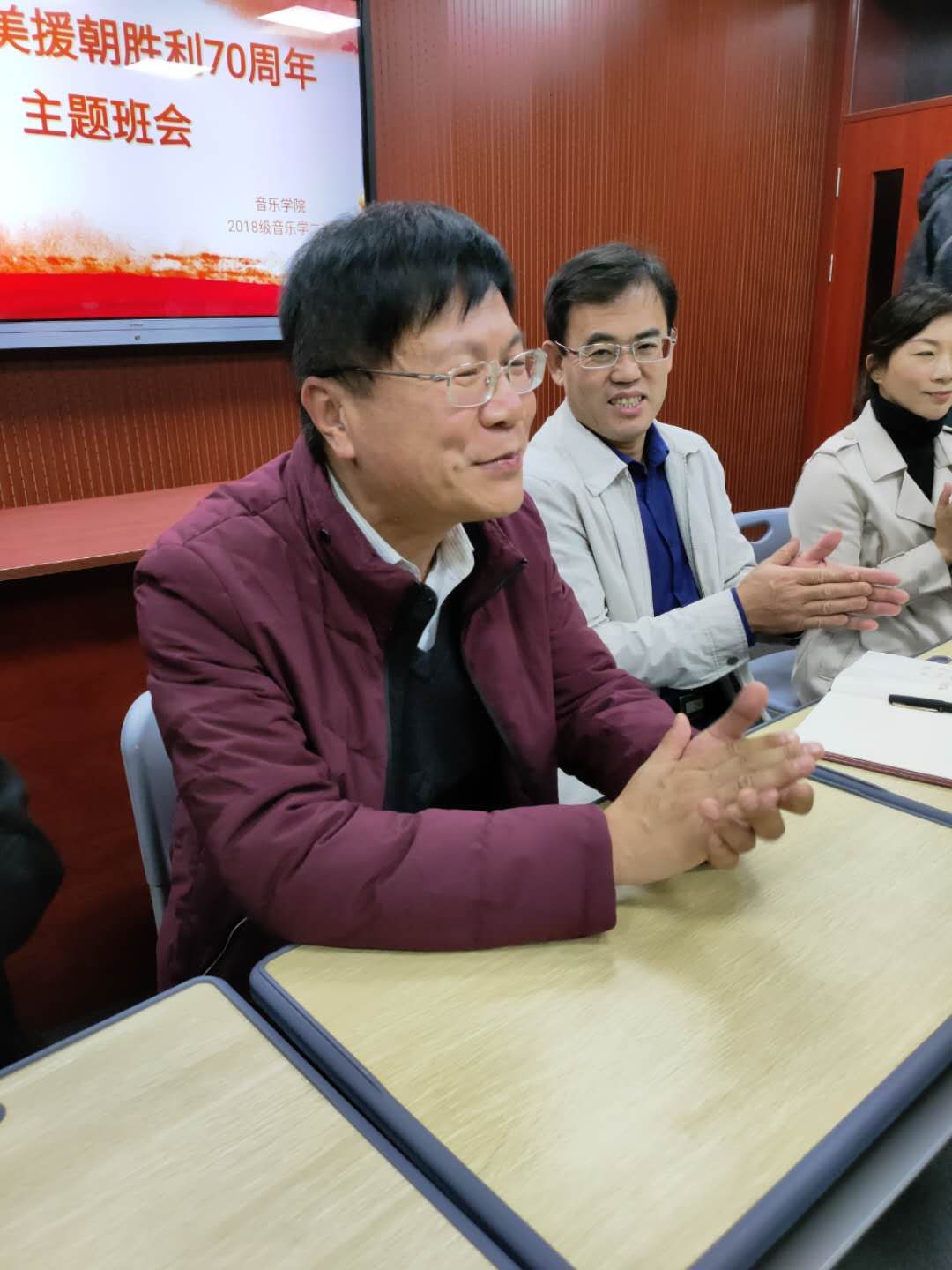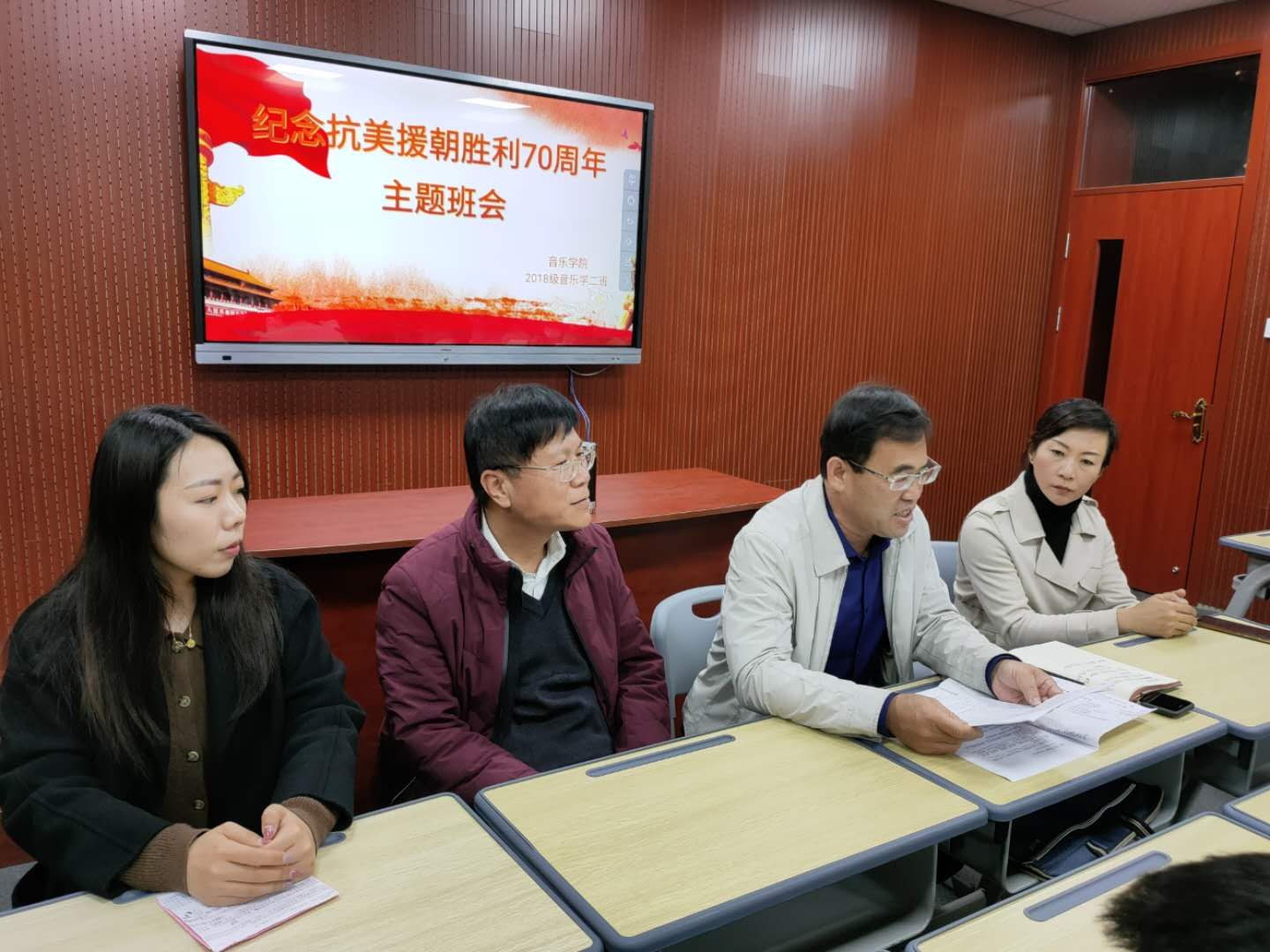 为推进建立健全领导干部常态化联系学生工作机制,加强学生思想政治教育,11月1日,基建处处长翟彦民深入英国正版365首页,参加指导了2018级音乐学二班“纪念抗美援朝70周年”主题班会。党总支书记刘志华,党总支副书记贺昱,2018级音乐学二班班主任李曼宁及全体学生参加了本次班会。