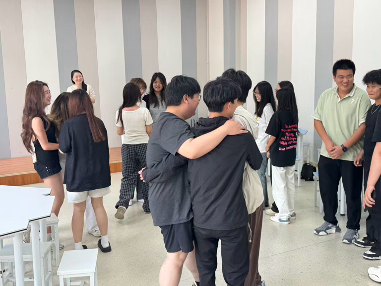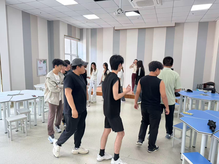 随后的互动环节精彩纷呈。在“桃花朵朵开”抱团游戏中,学生们围成一圈,随着高歌老师口令的下达,迅速依据指令组队抱团。卡片编剧情环节将活动推向高潮。高歌老师为每位学生发放写有特定词汇或短句的卡片,学生们以卡片内容为灵感源泉,充分发挥想象力,现场编排与“恋爱成长”主题相关的小剧情,生动的展示赢得现场掌声不断。