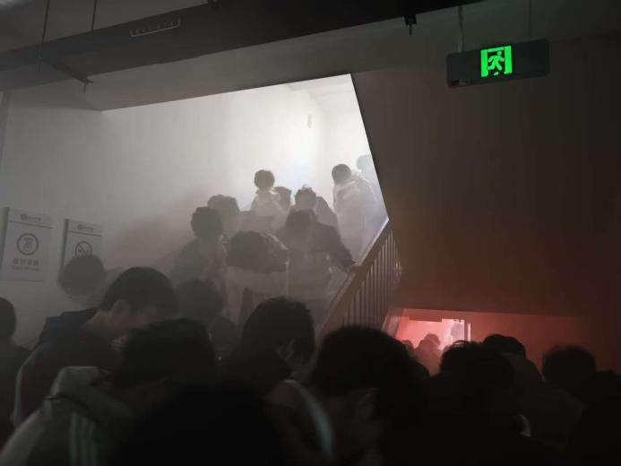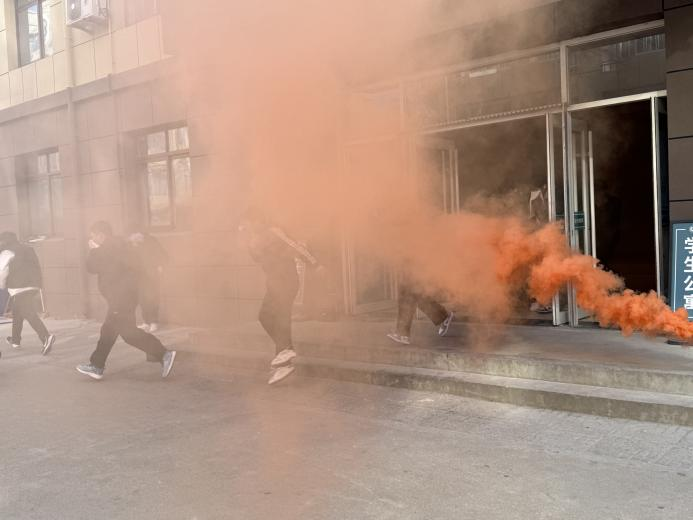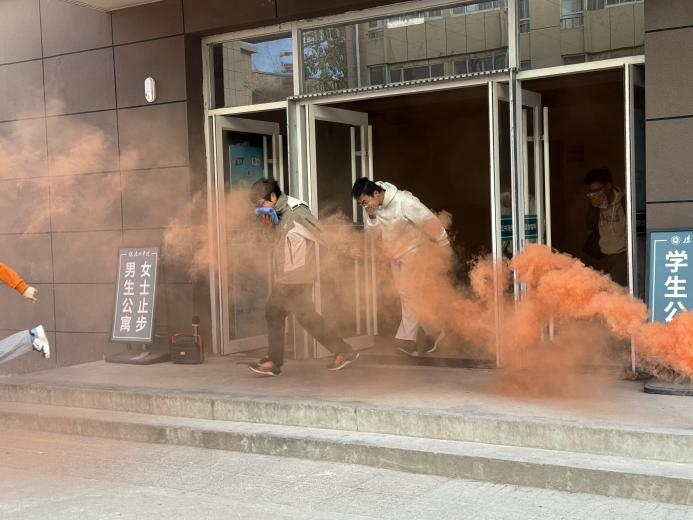 随着消防警报响起与模拟烟雾的扩散,演习正式启动。公寓楼内新生在老师及学生骨干的指引下,迅速用湿毛巾捂住口鼻,低姿弯腰,沿指定安全通道快速撤离。疏散过程中,各楼层引导员沉着冷静、配合密切,有效维护了楼道秩序。全体新生严格遵循疏散逃生路线,在预定时间内快速、有序地撤离至指定安全区域并完成集结,圆满完成了本次疏散任务。