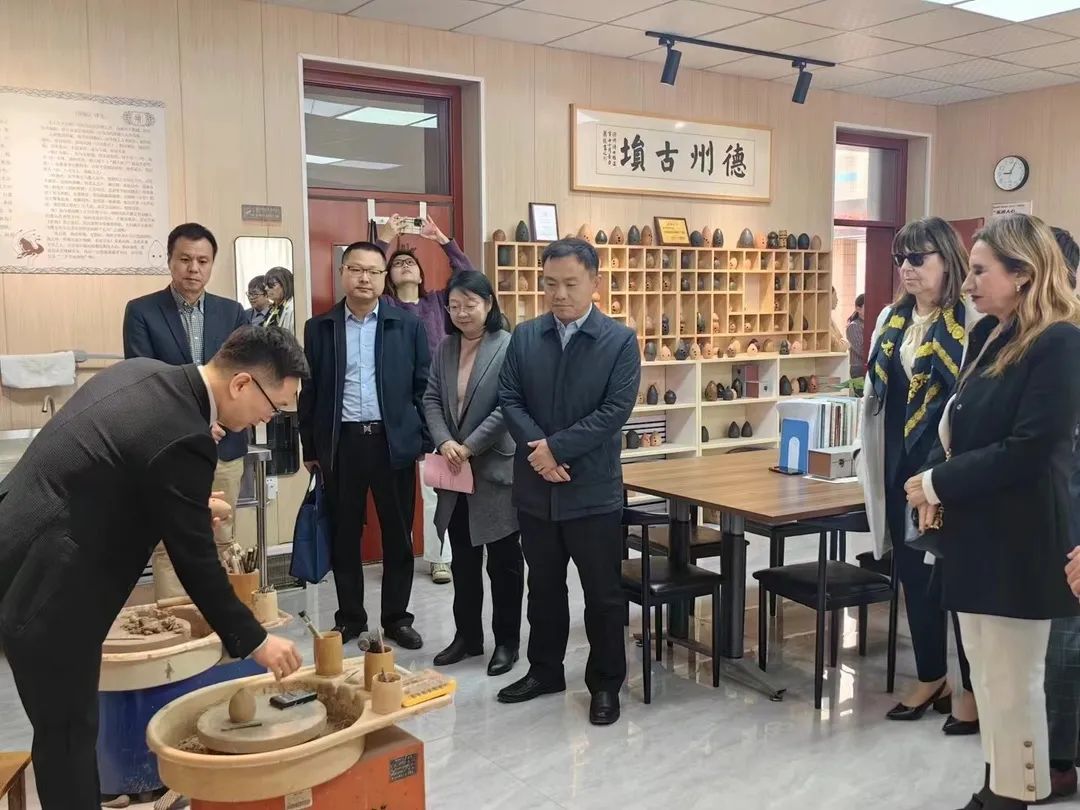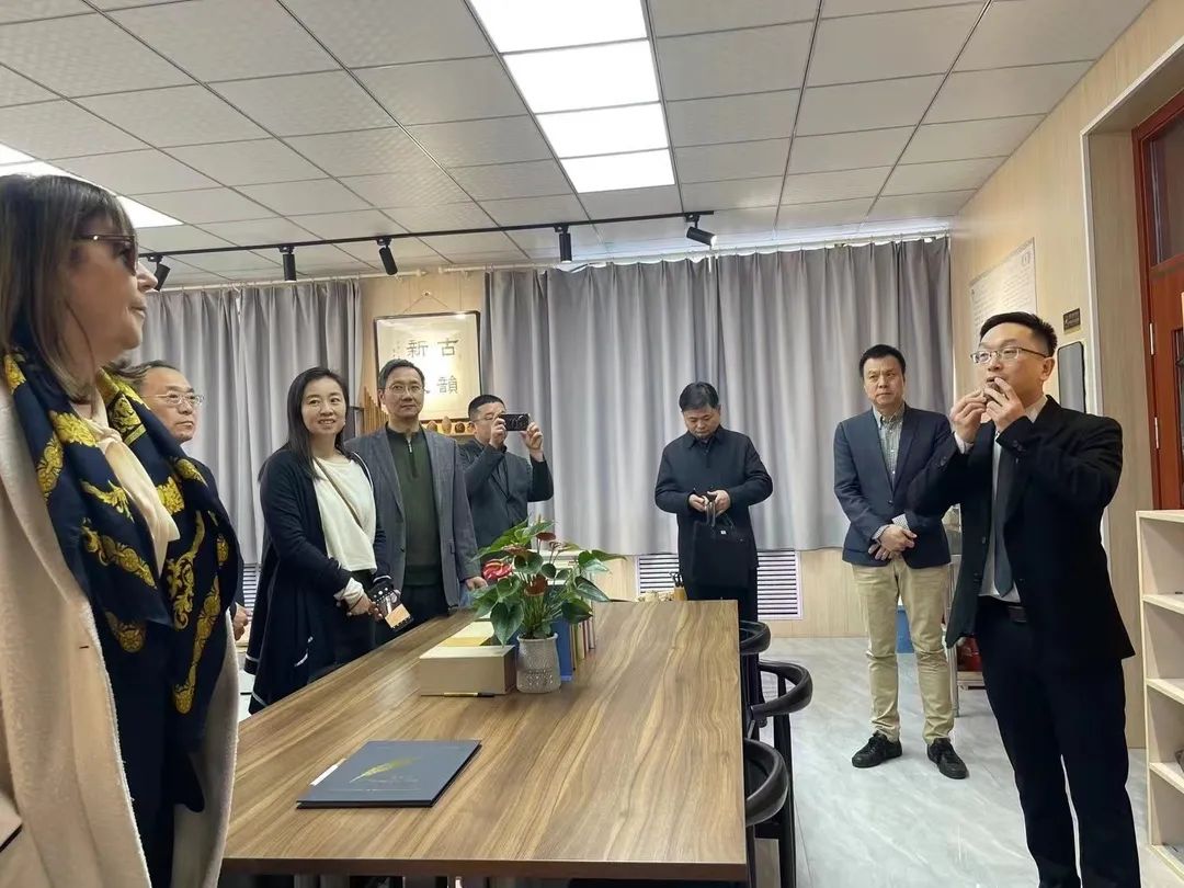 签约仪式结束后,来访人员还参观了我院德州古埙工作室、一勾勾工作室,对学院的专业教学给予了高度评价。特别是在传统音乐文化展示环节,与我院教师就传统器乐演奏进行了深入探讨。