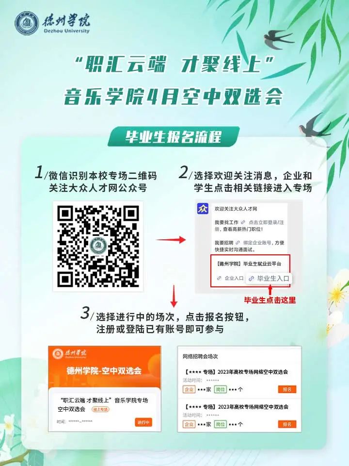 为深入贯彻落实党中央国务院关于高校毕业生就业工作的重要指示精神和“稳就业、保就业”决策部署,积极做好高校毕业生等重点群体就业工作,根据省人社厅和教育厅对高校毕业生就业工作的相关要求,学院联合大众人才网就业平台举办持续性、常态化的空中双选会系列活动,为各企事业单位的招聘和学校应、往届毕业生稳定就业拓路护航,诚挚邀请您参会。