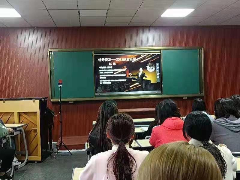 优秀校友赵鹏有成功地考研经历,后又在高校任职,目前在国外攻读博士学位,师从名师,在音乐领域深耕多年,求学经历丰富。赵鹏分四个层次进行讲授:学习工作经历、求学历程、留学见闻及职业生涯规划建议。他生动有趣的语言深深吸引在场学生,特别是介绍自己的考研心得,结合自己的考研经历详细的给同学们讲解了读研的必要和在备考期间应注意的问题,包括考研信心的树立、考研计划、备考心态的调整、生活饮食习惯、作息时间安排等等。