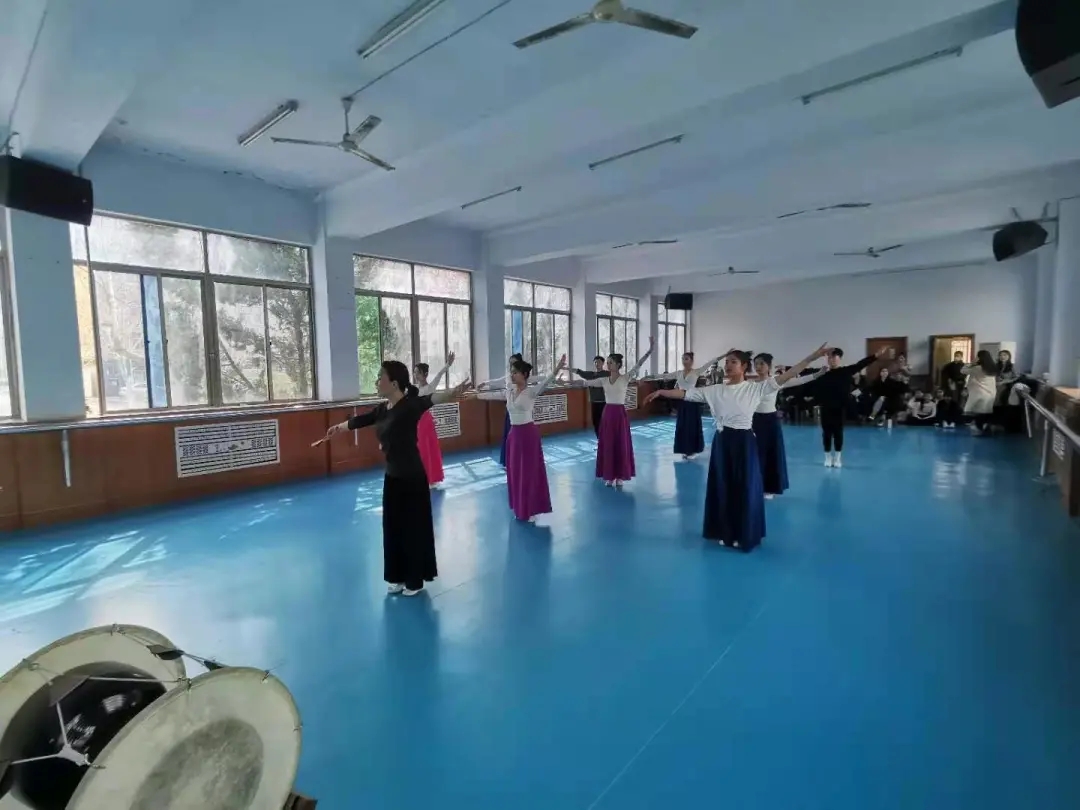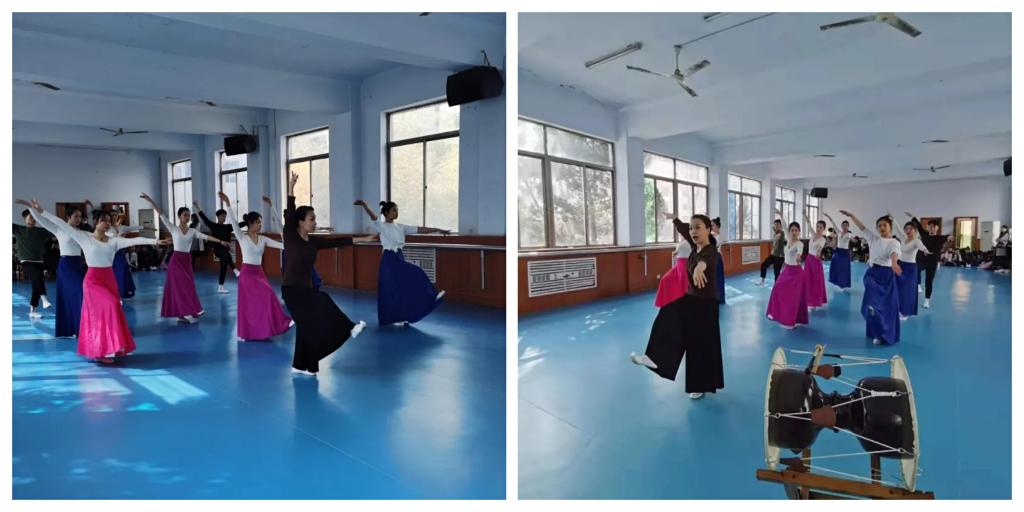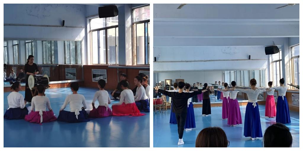 金主英教授以韩国传统舞蹈的基本节奏为课题,指导学生完成韩国传统舞蹈基本动作组合。虽然语言不通,但金主英教授带着饱满的热情,亲自示范、耐心讲解,对学生不理解的舞蹈动作难点进行反复示范、修正,用自己优雅的舞蹈动作和精致的艺术追求带动学生们的学习积极性。在教授韩国长岛鼓的基本节拍时,金教授准备了详细的中韩文双语教案,巧妙运用符号认知的形式,使学生们快速熟悉并掌握长岛鼓的基本节奏特点,课堂教学气氛热烈而充满艺术性。