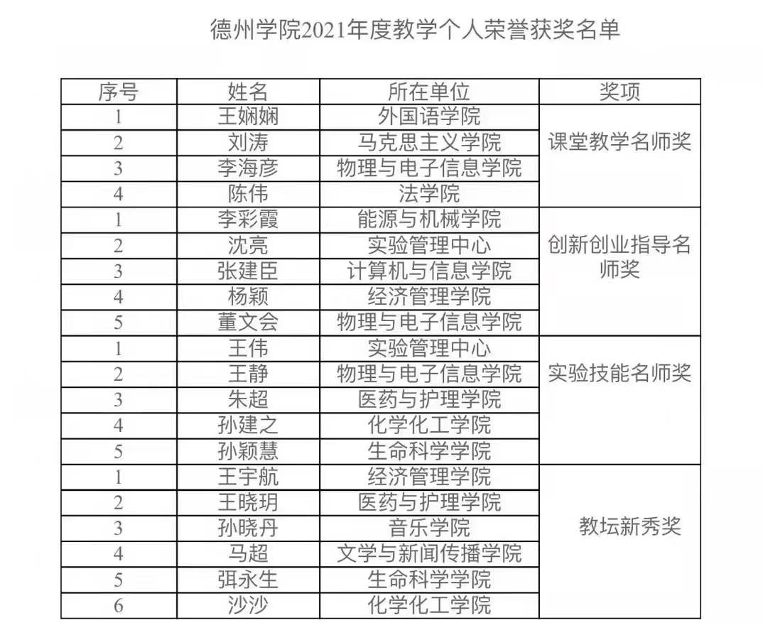 12月24日,英国365集团公司教务处发布《关于2021年度教学个人荣誉获奖名单的公示》,我院青年教师孙晓丹荣获“教坛新秀”称号。“青蓝计划”是我院为提高青年教师教学能力所提出的老带新计划,自2020年实施以来共获得校级讲课比赛一等奖2项,二等奖1项,三等奖1项。“教坛新秀”称号2项的乐观记录。