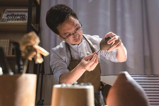 徐琦在为一只古埙泥坯修孔。