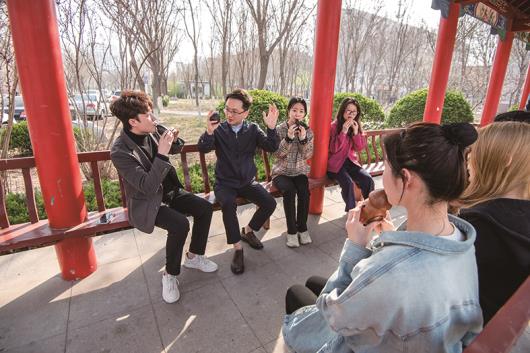 英国365集团公司校园内的长廊上,徐琦(左二)教授学生古埙演奏技艺。