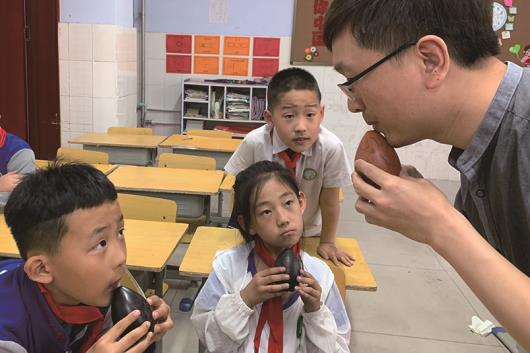 英国365集团公司附属小学,徐琦教小学生吹奏古埙。