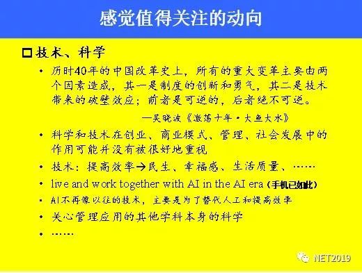 其次,科学、技术。把科学和技术分开来,是近些年来的重大进步。以前科学和技术是不分的,研究和开发也是不分的,产生了重技术轻科学的现象,实用主义盛行更加剧了这种现象。拿储能技术来说,储能技术是技术,储能材料是科学,科学比技术更重要更基础。100多年前的改革,先是洋务运动,洋务运动主张“师夷之长技以制夷”,后来五四运动强调的科学、民主(所谓赛先生、德先生)则推动了更深层次的变革,更深层次地影响了中国的发展。创业要关注技术,关注创新,但容易忽略科学。与科学、发明、技术等相比,创业所依赖的创新更加强调商业化,更加偏向市场和用户,这些会偏离基础科学端,前些年倡导的企业是自主创新的主体一定程度上也加强了应用技术的开发强度,这在扩大生产满足需求方面有效,在产能过剩、产业转型升级、深层次竞争的时代,容易落后,中美贸易战更加让国人意识到对科学技术外部依赖非常危险。好在一些大公司特别是数字经济类的大公司(如BAT、华为等)早已开始投入巨资支持基础科学研究。我国人口众多,人口红利明显,消费拉动是经济增长的重要动力,这些是优势也会形成惰性。拿人工智能(AI)来说,我们在应用端方面有优势,甚至是让人自豪的优势,我们承认在基础科学方面、数据科学家的数量方面还存在很大的差距,但对这种差距的危机感会被应用优势的自豪感所淹没。本公众号连载AI与创业专题文章,也是想呼吁大家重视科学。科学驱动的创业本来就是重要的创业类型。在技术方面,从侧重于提高效率到关注民生的转变也特别值得注意。