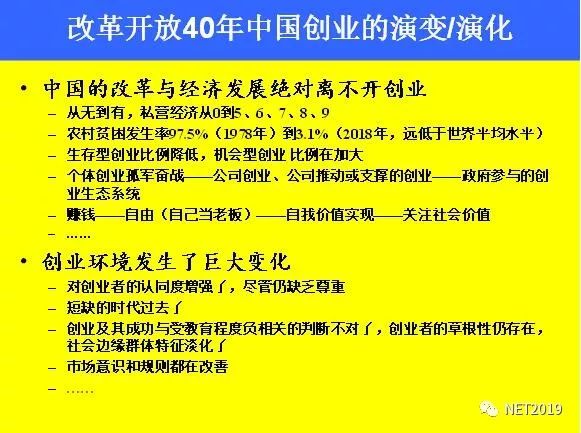 再来说国内,改革开放40年取得了天翻地覆的变化。改革开放初期,我国的创业是从农村经济落后地区、由社会边缘群体小心翼翼地起步。今天,创业者群体大众化了,大量的海归创业者,创业仍然具有从零起步的特点,但起点不同了;短缺的时代基本过去了,产能过剩成为主要问题,质量成为进入市场的基本门槛,创造价值、工匠精神、创造需求成为竞争优势的来源。
